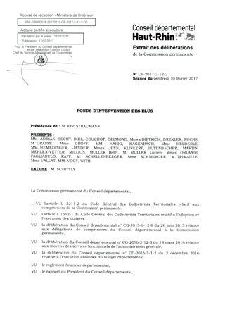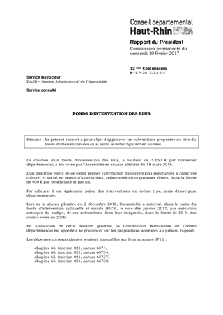 FONDS D'INTERVENTION DES ELUS Resumé Pièces jointes DELIBERATION RAPPORT ANNEXE Assemblée : Commission Permanente Date : 10/02/2017 Rapporteur : Non défini Collectivité : Conseil départemental du Haut-Rhin Direction : Non défini Service : Service Administratif de l'Assemblée Domaine : Aides / Subventions Commission : Commission Permanente