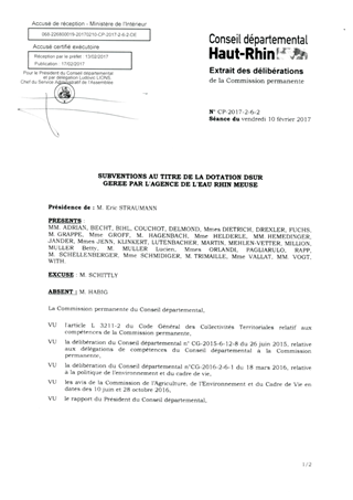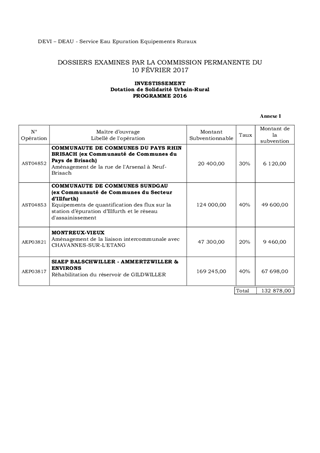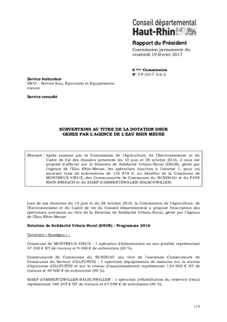 SUBVENTIONS AU TITRE DE LA DOTATION DSUR GEREE PAR L'AGENCE DE L'EAU RHIN MEUSE Resumé Pièces jointes DELIBERATION RAPPORT ANNEXE Assemblée : Commission Permanente Date : 10/02/2017 Rapporteur : Non défini Collectivité : Conseil départemental du Haut-Rhin Direction : Non défini Service : Service Eau, Épuration, Équipements ruraux Domaine : Aides / Subventions Commission : Commission Permanente