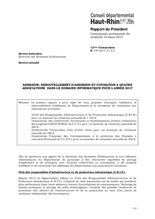 Le présent rapport a pour objet de vous proposer d’accepter l’adhésion, le renouvellement d'adhésion du Département et le versement de cotisations aux associations suivantes : •Club des Responsables d’Infrastructure et de Production informatique (C.R.I.P.) pour un montant de cotisation annuelle de 1 440 €. •Association des Collectivités Territoriales et Etablissements Publics Utilisateurs des Logiciels CEGID PUBLIC (A.C.T.U.) pour un montant de cotisation annuelle de 500 €. •Collectivités Territoriales Club (CoTer Club) pour un montant de cotisation annuelle de 480 €. •Association Française des Correspondants à la protection des Données à caractère Personnel (A.F.C.D.P.) pour un montant de cotisation annuelle de 450 €.