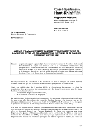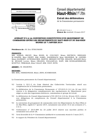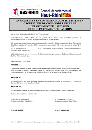 AVENANT N 4 A LA CONVENTION CONSTITUTIVE D'UN GROUPEMENT DE COMMANDES ENTRE LES DEPARTEMENTS DU HAUT-RHIN ET DU BAS-RHIN SIGNEE LE 7 JANVIER 2014