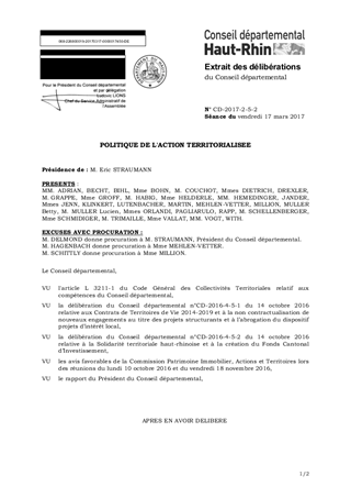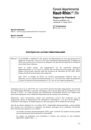 La loi NOTRe a confirmé le rôle majeur du Département en tant que garant de la solidarité territoriale. C’est à ce titre que l’Assemblée départementale a redéfini en 2016 son soutien aux territoires en adoptant les grands principes de la solidarité territoriale haut-rhinoise. Dans le même temps, nos engagements sur les anciennes politiques départementales ou en cours en faveur des territoires (ancien guide des aides, Projets structurants inscrits dans les Contrats de Territoire de Vie 2014-2019, Projets d’intérêt local) doivent être respectés. Pour 2017, le budget en faveur de l’action territorialisée s'élèvera ainsi, en dépenses, pour la section d'investissement, à 11 722 367 € de crédits de paiement et, pour la section de fonctionnement, à 721 381 € de crédits de paiement.