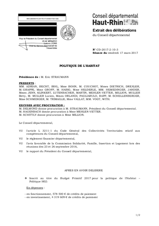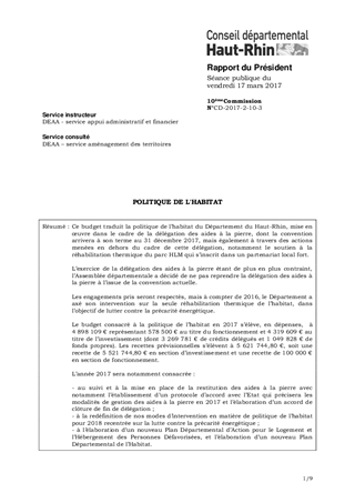 Ce budget traduit la politique de l’habitat du Département du Haut-Rhin, mise en œuvre dans le cadre de la délégation des aides à la pierre, dont la convention arrivera à son terme au 31 décembre 2017, mais également à travers des actions menées en dehors du cadre de cette délégation, notamment le soutien à la réhabilitation thermique du parc HLM qui s’inscrit dans un partenariat local fort. L’exercice de la délégation des aides à la pierre étant de plus en plus contraint, l’Assemblée départementale a décidé de ne pas reprendre la délégation des aides à la pierre à l’issue de la convention actuelle. Les engagements pris seront respectés, mais à compter de 2016, le Département a axé son intervention sur la seule réhabilitation thermique de l’habitat, dans l’objectif de lutter contre la précarité énergétique. Le budget consacré à la politique de l’habitat en 2017 s’élève, en dépenses, à 4 898 109 € représentant 578 500 € au titre du fonctionnement et 4 319 609 € au titre de l’investissement (dont 3 269 781 € de crédits délégués et 1 049 828 € de fonds propres). Les recettes prévisionnelles s’élèvent à 5 621 744,80 €, soit une recette de 5 521 744,80 € en section d’investissement et une recette de 100 000 € en section de fonctionnement. L’année 2017 sera notamment consacrée : - au suivi et à la mise en place de la restitution des aides à la pierre avec notamment l’établissement d’un protocole d’accord avec l’Etat qui précisera les modalités de gestion des aides à la pierre en 2017 et l’élaboration d’un accord de clôture de fin de délégation ; - à la redéfinition de nos modes d’intervention en matière de politique de l’habitat pour 2018 recentrée sur la lutte contre la précarité énergétique ; - à l’élaboration d’un nouveau Plan Départemental d’Action pour le Logement et l’Hébergement des Personnes Défavorisées, et l’élaboration d’un nouveau Plan Départemental de l’Habitat.
