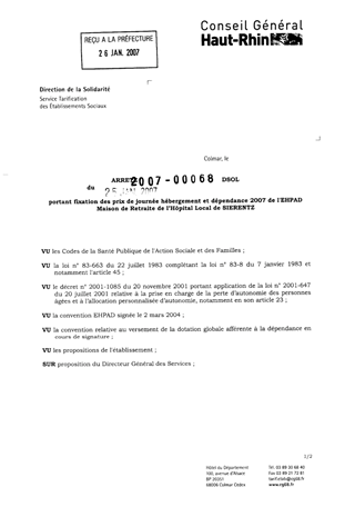 portant fixation des prix de journée hébergement et dépendance 2007 de l'EHPAD - Maison de retraite de l'hôpital local de SIERENTZ. Resumé Pièces jointes ARRETE Assemblée : Non défini Date : 25/01/2007 Rapporteur : Non défini Collectivité : Conseil départemental du Haut-Rhin Direction : Non défini Service : Service de la Tarification des Etablissements Domaine : Prix de Journée Commission :