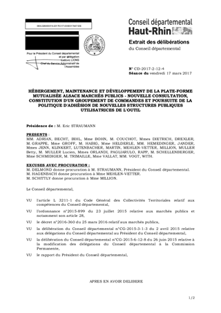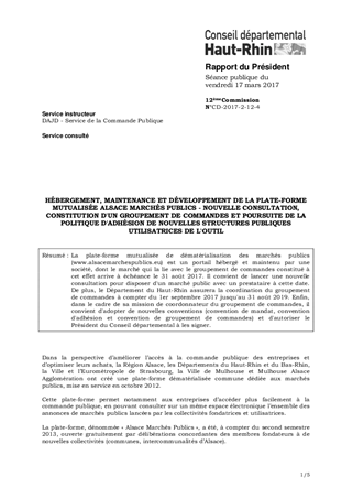 HÉBERGEMENT, MAINTENANCE ET DÉVELOPPEMENT DE LA PLATE-FORME MUTUALISÉE ALSACE MARCHÉS PUBLICS - NOUVELLE CONSULTATION, CONSTITUTION D'UN GROUPEMENT DE COMMANDES ET POURSUITE DE LA POLITIQUE D'ADHÉSION DE NOUVELLES STRUCTURES PUBLIQUES UTILISATRICES DE L'OUTIL