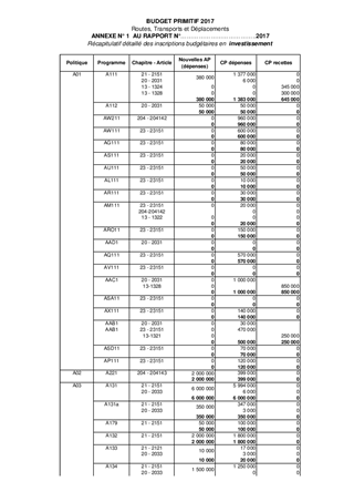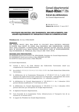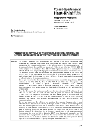 Le rapport présente les propositions du budget 2017 pour l’ensemble des dépenses et recettes afférentes aux politiques en faveur des routes, des transports, des grands équipements et des infrastructures de communications. Le montant global des crédits de paiement s’élève à un total de 48 725 203 € toutes dépenses confondues, dont 35 249 000 € pour les routes et transports et 13 476 203 € pour les grands équipements et infrastructures de communications. Le montant global des autorisations de programmes s’élève à un total de 21 431 092 € (19 280 000 € pour les routes et transports, dont 3 600 000 € anticipés en DM3 de l’exercice 2016, et 2 151 092 € pour les grands équipements et infrastructures de communications). En ce qui concerne les dépenses de fonctionnement, les crédits de paiement 2017 s’élèvent à 13 862 000 €, dont 6 292 000 € au titre des transports et déplacements, 5 110 000 € pour l’entretien courant du réseau routier, 2 400 000 € pour la viabilité hivernale et 60 000 € pour l’aide au fonctionnement des aérodromes de COLMAR-HOUSSEN et de MULHOUSE-HABSHEIM. Pour les dépenses d’investissement, les crédits de paiement 2017 s’élèvent à un total de 34 863 203 € dont 21 447 000 € pour les routes et transports (1 747 000 € de dépenses indirectes, 14 920 000 € pour la maintenance du réseau routier, 4 780 000 € au titre des travaux neufs) et 13 416 203 € pour la politique en faveur des grands équipements et des infrastructures de communications. En ce qui concerne la politique en matière des grands équipements et des infrastructures de communications, le budget 2017 se traduit notamment par la mise en œuvre opérationnelle de la démarche Très Haut Débit Alsace visant à déployer la fibre optique à l’horizon 2022 dans toutes les communes relevant de la zone d’initiative publique. Le Département du Haut-Rhin participe ainsi à ce double objectif de réduction de la fracture numérique et de développement économique de son territoire. L’année 2017 sera également marquée par la poursuite des engagements en faveur des équipements de transport aérien et ferroviaire et par la mise en service mi-décembre 2017 du prolongement de la ligne n° 3 du tramway de BALE jusqu’à la gare de SAINT-LOUIS.