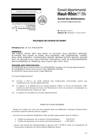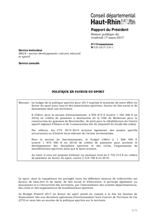 Le budget de la politique sportive pour 2017 exprime le maintien de notre effort en faveur du sport pour tous et des associations sportives, facteur de lien social et de dynamisme dans nos territoires. Il s’élève, pour la section d’investissement, à 905 815 € (contre 1 340 206 € en 2016) en crédits de paiement à destination de la Ville de Mulhouse pour la construction du gymnase de Bourtzwiller, de m2A pour la réhabilitation du Centre sportif régional d’Alsace et de 3 associations (fin du dispositif du Guide des aides). Par ailleurs, les CTV 2014-2019 incluent également des projets sportifs structurants ou d'intérêt local relevant de l'Action territorialisée. Pour la section de fonctionnement, le budget s’élève à 1 826 500 € (contre 1 876 500 € en 2016) de crédits de paiement pour soutenir le développement des disciplines sportives et des clubs, l’organisation de manifestations sportives ainsi que le sport scolaire. Au total, il vous est proposé d’allouer un montant total de 2 732 315 € en crédits de paiement en faveur du sport, contre 3 216 706 € en 2016.