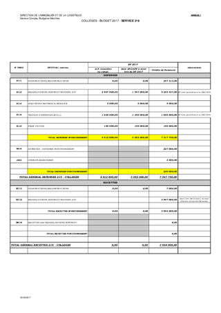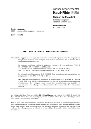 Le rapport a pour objet de soumettre au Conseil départemental les propositions budgétaires relatives aux collèges, aux actions éducatives et en faveur de la jeunesse pour l’année 2017. Le montant total des crédits de paiement consacrés à cette politique s’élève à 22 680 402 € (25 560 286 € en 2016), soit : - 14 958 992 € en crédits de fonctionnement (15 782 865 € en 2016), - et 7 721 410 € en crédits d’investissement (9 777 421 € en 2016) Ils nécessiteront l’inscription de 3 923 500 € en investissement (autorisation de programme) contre 14 216 750 € en 2016. Des recettes sont également attendues à concurrence de 5 404 000 € contre 5 656 740 € en 2016, principalement au titre de la dotation départementale d’équipement des collèges, mais aussi des contributions des familles et commensaux aux charges de rémunération des personnels de restauration scolaire.