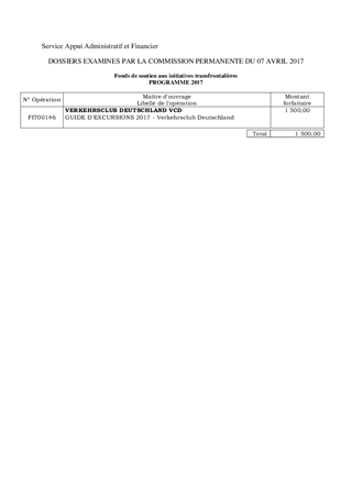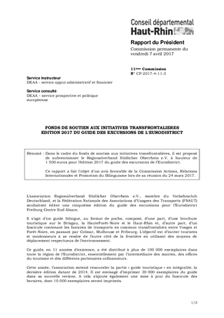 Dans le cadre du fonds de soutien aux initiatives transfrontalières, il est proposé de subventionner le Regionalverband Südlicher Oberrhein e.V. à hauteur de 1 500 euros pour l’édition 2017 du guide des excursions de l’Eurodistrict. Ce rapport a fait l'objet d'un avis favorable de la Commission Actions, Relations Internationales et Promotion du Bilinguisme lors de sa réunion du 24 mars 2017.