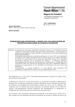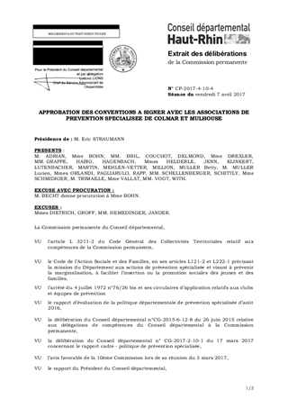 APPROBATION DES CONVENTIONS A SIGNER AVEC LES ASSOCIATIONS DE PREVENTION SPECIALISEE DE COLMAR ET MULHOUSE