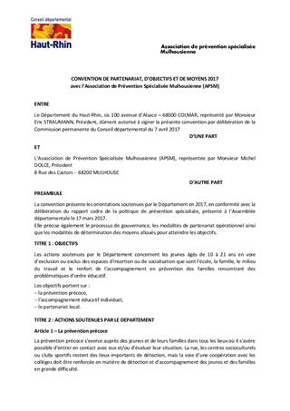 La politique de prévention spécialisée, financée à hauteur de 1,925 M€ en 2016, s’appuie sur les actions menées par deux clubs de prévention : l’association de prévention spécialisée de Colmar (APSC) et l’association de prévention spécialisée Mulhousienne (APSM). L’Assemblée départementale a précisé sa politique le 17 mars 2017, en confirmant la position de la 10ème commission du 21 octobre 2016, qui a validé le principe de cadrer les interventions de la prévention spécialisée autour de 3 grandes orientations majeures de la protection de l’enfance : la détection précoce, l’accompagnement éducatif des préadolescents et adolescents et l’intégration des associations dans les instances de partenariat local. Elle a également défini le processus de gouvernance et les modalités de partenariat avec les clubs de prévention. Conformément au rapport présenté le 17 mars dernier, une convention de partenariat, d'objectifs et de moyens vous est présentée pour 2017.