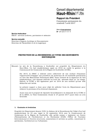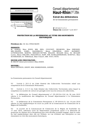 Le site de la Neuenbourg à Guebwiller est propriété du Département du Haut-Rhin. Un bail emphytéotique signé en 2016 en confie la gestion à la Communauté de Communes de la Région de Guebwiller (CCRG). Fin 2015, la DRAC a informé notre collectivité de son souhait d’examiner l’opportunité d’engager une procédure de protection de cet ensemble patrimonial au titre des Monuments Historiques (MH). Dans l’attente de la signature du bail emphytéotique, une réponse réservée lui avait été adressée dans un 1er temps. Depuis, la CCRG a fait également part en 2016 de son souhait qu’une telle démarche soit initiée. Le présent rapport a donc pour objet de solliciter l’avis du Département pour relancer le processus d’un éventuel classement. Aussi vous est-il proposé de répondre favorablement à la demande de la CCRG et de la DRAC, la 7ème Commission réunie le 27 janvier 2017 ayant émis un avis favorable.