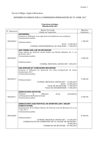 Au titre de sa politique culturelle, le Conseil départemental a adopté différents dispositifs permettant de soutenir diverses composantes du secteur culturel : « Expressions Artistiques », « Lieux de Diffusion et Opérateurs Culturels » et « Enseignement Artistique et Pratique ». Il est proposé, dans le présent rapport : I « Expressions Artistiques » - d’attribuer et d'autoriser le versement de subventions de fonctionnement pour un montant total de 36 250 € à 12 associations pour des aides aux projets ; II « Lieux de Diffusion et Opérateurs Culturels » - d’attribuer et d'autoriser le versement de subventions de fonctionnement pour un montant total de 574 500 € en faveur de l'Association Le Lézard, la Comédie de l'Est (CDE), le Centre Européen d'Etudes Japonaises (CEEJA), la Filature et l'Institut Européen des Arts Céramiques (IEAC) ; III « Enseignement Artistique et Pratique » - d’attribuer et d'autoriser le versement de subventions de fonctionnement pour un montant total de 441 000 € en faveur de 6 structures concourant à la mise en œuvre du Schéma Départemental des Enseignements Artistiques (SDEA), dont le Groupement d'Employeurs de l'Enseignement Musical (GEEM), Mission Voix Alsace (MVA), la Fédération des Sociétés de Musique d'Alsace (FSMA) et les 3 conservatoires des villes de Colmar, Mulhouse et Saint-Louis ; Il vous est également proposé d’approuver et de m'autoriser à signer les conventions à intervenir avec les associations précitées. Ce rapport a fait l’objet d’un avis favorable de la 7ème Commission réunie le 27 janvier, le 10 février et le 10 mars 2017.