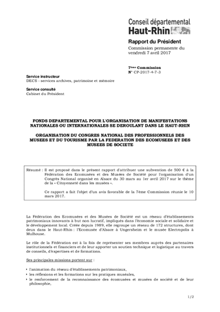Il est proposé dans le présent rapport d'attribuer une subvention de 500 € à la Fédération des Ecomusées et des Musées de Société pour l'organisation d'un Congrès National organisé en Alsace du 30 mars au 1er avril 2017 sur le thème de la « Citoyenneté dans les musées ». Ce rapport a fait l’objet d’un avis favorable de la 7ème Commission réunie le 10 mars 2017.