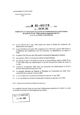 Portant sur l'autorisation d'ouverture de l'établissement d'accueil d'enfants de moins de six ans Halte garderie temporaire Bel' Air Resumé Pièces jointes ARRETE Assemblée : Non défini Date : 16/04/2002 Rapporteur : Non défini Collectivité : Conseil départemental du Haut-Rhin Direction : Non défini Service : Service de Protection Maternelle et Infantile Domaine : Accueil d'enfants Commission :