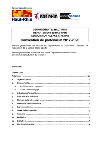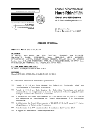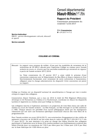 Le rapport vous propose de valider, d’une part les modalités de versement de la subvention de 30 000 € allouée pour l’opération Collège au cinéma pour l’année scolaire en cours, et, d’autre part les nouvelles modalités qui entreront en vigueur à partir de l’année scolaire 2017/2018. La 7ème commission du 27 janvier 2017 a ainsi validé le principe d’une convention commune avec le Département du Bas-Rhin et Alsace cinémas et d’un fonctionnement harmonisé, avec versement de notre subvention à l’association, allégeant ainsi la charge administrative du dispositif. Cette convention est jointe au rapport.