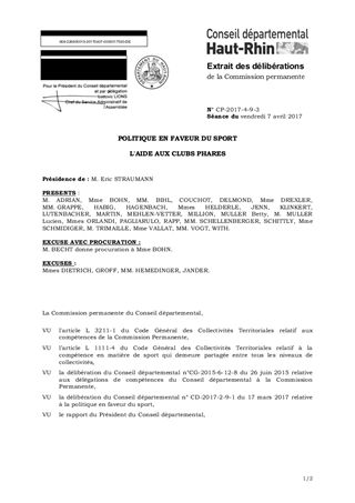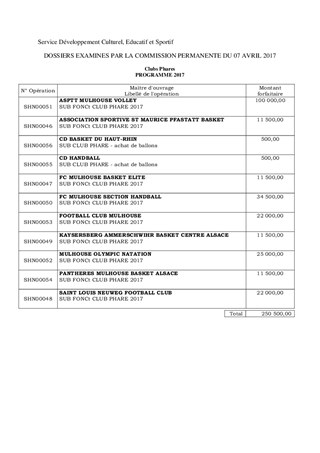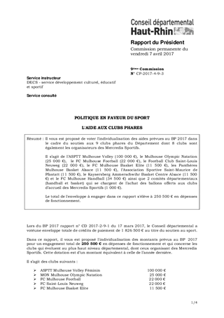Il vous est proposé de voter l'individualisation des aides prévues au BP 2017 dans le cadre du soutien aux 9 clubs phares du Département dont 8 clubs sont également les organisateurs des Mercredis Sportifs. Il s’agit de l’ASPTT Mulhouse Volley (100 000 €), le Mulhouse Olympic Natation (25 000 €), le FC Mulhouse Football (22 000 €), le Football Club Saint-Louis Neuweg (22 000 €), le FC Mulhouse Basket Elite (11 500 €), les Panthères Mulhouse Basket Alsace (11 500 €), l’Association Sportive Saint-Maurice de Pfastatt (11 500 €), le Kaysersberg Ammerschwihr Basket Centre Alsace (11 500 €) et le FC Mulhouse Handball (34 500 €) ainsi que 2 comités départementaux (handball et basket) qui se chargent de l’achat des ballons offerts aux clubs d’accueil des Mercredis Sportifs (1 000 €). Le total de l'enveloppe à engager dans ce rapport s'élève à 250 500 € en dépenses de fonctionnement.