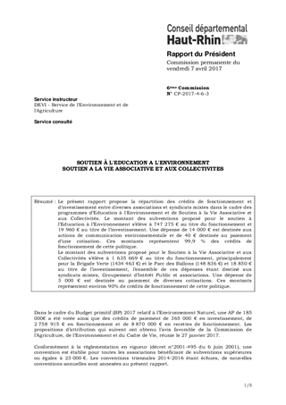 Le présent rapport propose la répartition des crédits de fonctionnement et d'investissement entre diverses associations et syndicats mixtes dans le cadre des programmes d’Education à l'Environnement et de Soutien à la Vie Associative et aux Collectivités. Le montant des subventions proposé pour le soutien à l’Education à l’Environnement s’élève à 747 275 € au titre du fonctionnement et 19 960 € au titre de l’investissement. Une dépense de 14 000 € est destinée aux actions de communication environnementale et de 40 € destinée au paiement d’une cotisation. Ces montants représentent 99,9 % des crédits de fonctionnement de cette politique. Le montant des subventions proposé pour le Soutien à la Vie Associative et aux Collectivités s’élève à 1 635 669 € au titre du fonctionnement, principalement pour la Brigade Verte (1434 463 €) et le Parc des Ballons (148 836 €) et 18 850 € au titre de l’investissement, l’ensemble de ces dépenses étant destiné aux syndicats mixtes, Groupement d’Intérêt Public et associations. Une dépense de 3 000 € est destinée au paiement de diverses cotisations. Ces montants représentent environ 90% de crédits de fonctionnement de cette politique.