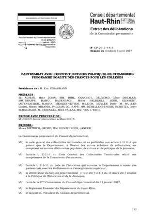 La commission Education et Jeunesse du 13 janvier 2017 a donné un avis favorable à un partenariat avec l’Institut d’Etudes Politiques de Strasbourg (Sciences Po Strasbourg), composante de l’Université de Strasbourg, concernant 70 élèves de classes de troisième issus de 7 collèges haut-rhinois en REP ou REP+, relatif à un projet favorisant l’égalité des chances et l’accès aux études supérieures d’élèves issus de quartiers défavorisés : le Programme d’Etudes Intégrées (PEI). Un engagement départemental de 7 000 € par an pendant 3 ans est sollicité. Une convention portant sur les années 2017 à 2019 est jointe au rapport.