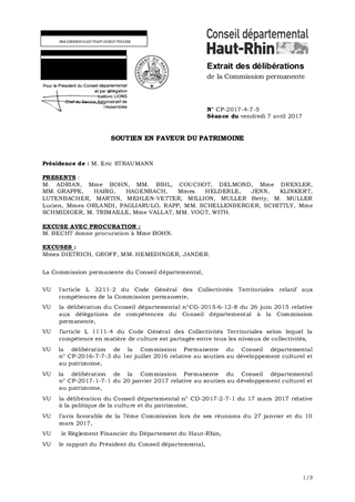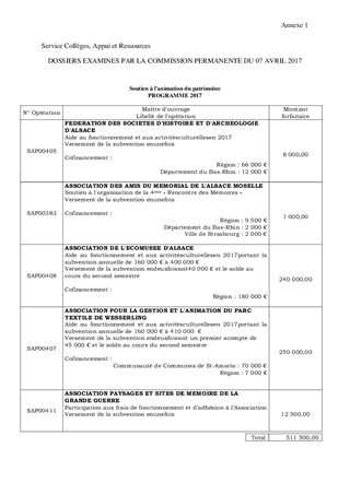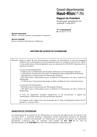 Dans le cadre de nos interventions en faveur du patrimoine, il vous est proposé d’allouer des subventions de fonctionnement pour un montant total de 511 500 € et des subventions d’investissement pour un montant de 430 000 € réparties de la manière suivante : au titre du fonctionnement : - 8 000 € pour la Fédération des Sociétés d’Histoire et d’Archéologie d’Alsace - 1 000 € pour l’Association des Amis du Mémorial Alsace Moselle de Schirmeck - 240 000 € pour l’Association de l’Ecomusée d’Alsace - 250 000 € pour l’Association pour la Gestion et l’Animation du Parc Textile de Wesserling - 12 500 € pour l’Association Paysages et Sites de Mémoire de la Grande Guerre au titre de l’investissement : - 250 000 € pour l’Association de l’Ecomusée d’Alsace - 180 000 € pour l’Association pour la Gestion et l’Animation du Parc Textile de Wesserling Il vous est également proposé d’approuver et de m'autoriser à signer les conventions à intervenir avec les partenaires précités. Ce rapport a fait l’objet d’un avis favorable de la 7ème Commission réunie les 27 janvier et 10 mars 2017.