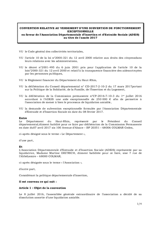 CONVENTION RELATIVE AU VERSEMENT D'UNE SUBVENTION EXCEPTIONNELLE EN FAVEUR DE L'ASSOCIATION DEPARTEMENTALE D'INSERTION ET D'ENTRAIDE SOCIALE (ADEIS)
