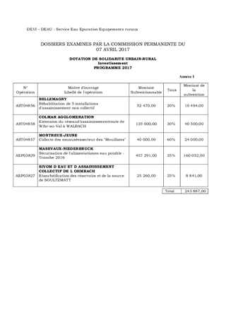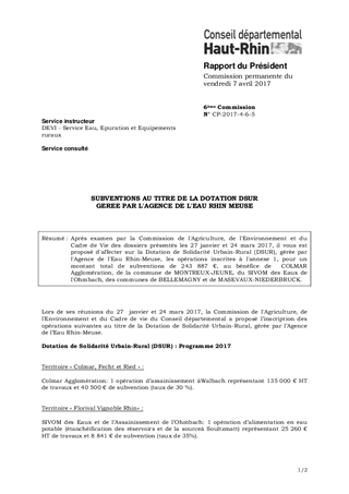Après examen par la Commission de l'Agriculture, de l'Environnement et du Cadre de Vie des dossiers présentés les 27 janvier et 24 mars 2017, il vous est proposé d'affecter sur la Dotation de Solidarité Urbain-Rural (DSUR), gérée par l'Agence de l'Eau Rhin-Meuse, les opérations inscrites à l'annexe 1, pour un montant total de subventions de 243 887 €, au bénéfice de COLMAR Agglomération, de la commune de MONTREUX-JEUNE, du SIVOM des Eaux de l'Ohmbach, des communes de BELLEMAGNY et de MASEVAUX-NIEDERBRUCK.
