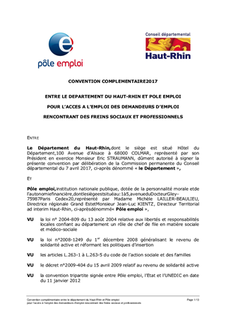 Depuis la mise en œuvre du rSa en 2009, la loi reconnaît Pôle Emploi en tant que partenaire prépondérant de la politique départementale d’insertion. Dans le Haut-Rhin, un partenariat fructueux entre Pôle Emploi et le Département a permis, ces dernières années, de nombreuses sorties positives vers l’emploi et ceci, dans un contexte économique difficile. Depuis 2015, la convention entre le Département du Haut-Rhin et Pôle Emploi pour l’accès des demandeurs d’emploi rencontrant des freins sociaux et professionnels a permis la mise en œuvre de nouvelles modalités de collaboration entre les deux institutions. Celles-ci se traduisent par un accompagnement global du demandeur d’emploi. Du point de vue pratique, la personne est suivie pour sa demande d’emploi par Pôle Emploi et, dans le même temps, par le Département pour tout problème social rencontré dans cette recherche d’emploi. Cette convention a déjà fait l’objet d’une reconduction d’un an en 2016. Le bilan positif de ce partenariat amène à vous proposer d’en établir une nouvelle pour 2017, sur la base de la précédente, pour une durée d’un an et sans incidence financière pour le Département. La convention 2017 est jointe à cet effet au présent rapport.