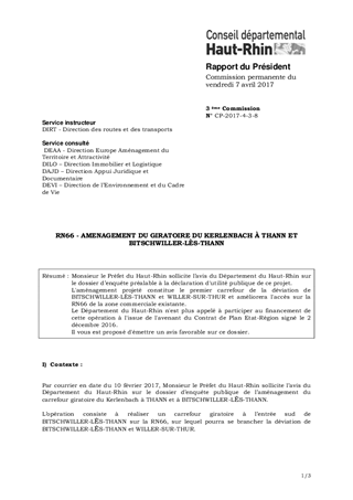 Monsieur le Préfet du Haut-Rhin sollicite l’avis du Département du Haut-Rhin sur le dossier d’enquête préalable à la déclaration d'utilité publique de ce projet. L'aménagement projeté constitue le premier carrefour de la déviation de BITSCHWILLER-LÈS-THANN et WILLER-SUR-THUR et améliorera l'accès sur la RN66 de la zone commerciale existante. Le Département du Haut-Rhin n'est plus appelé à participer au financement de cette opération à l'issue de l'avenant du Contrat de Plan Etat-Région signé le 2 décembre 2016. Il vous est proposé d'émettre un avis favorable sur ce dossier.