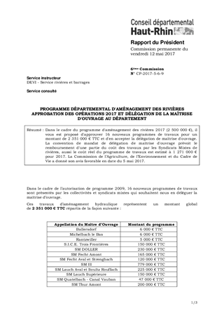 Dans le cadre du programme d'aménagement des rivières 2017 (2 500 000 €), il vous est proposé d'approuver 16 nouveaux programmes de travaux pour un montant de 2 351 000 € TTC et d'en accepter la délégation de maîtrise d'ouvrage. La convention de mandat de délégation de maîtrise d'ouvrage prévoit le remboursement d'une partie du coût des travaux par les Syndicats Mixtes de rivières, aussi le coût réel du programme de travaux est estimé à 1 271 000 € pour 2017. La Commission de l’Agriculture, de l’Environnement et du Cadre de Vie a donné son avis favorable en date du 5 mai 2017.