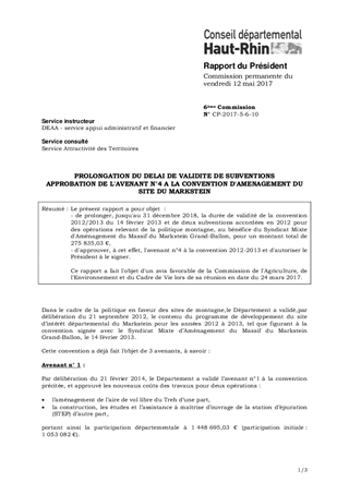 Le présent rapport a pour objet : - de prolonger, jusqu'au 31 décembre 2018, la durée de validité de la convention 2012/2013 du 14 février 2013 et de deux subventions accordées en 2012 pour des opérations relevant de la politique montagne, au bénéfice du Syndicat Mixte d'Aménagement du Massif du Markstein Grand-Ballon, pour un montant total de 275 835,03 €, - d'approuver, à cet effet, l'avenant n°4 à la convention 2012-2013 et d'autoriser le Président à le signer. Ce rapport a fait l'objet d'un avis favorable de la Commission de l'Agriculture, de l'Environnement et du Cadre de Vie lors de sa réunion en date du 24 mars 2017.