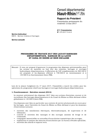 PROGRAMME DE TRAVAUX 2017 DES LACS ET BARRAGES DEPARTEMENTAUX, BARRAGE DE LA LAUCH ET CANAL DU RHONE AU RHIN DECLASSE