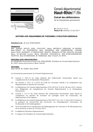 Dans le cadre de la politique de soutien aux organismes de tourisme à vocation générale, il est proposé d'attribuer un montant total de 38 000 € en faveur de quatre associations, au titre de leur fonctionnement 2017. Ce rapport a fait l'objet d'un avis favorable de la Commission de l'Aménagement du Territoire et de l'Economie lors de sa réunion du 24 mars 2017.