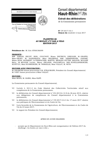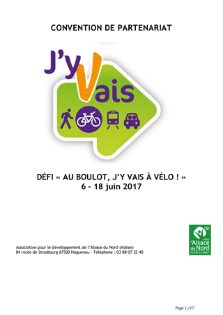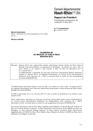 Depuis 2010, des collectivités locales alsaciennes s’étant dotées de Plan Climat Energie Territorial (PCET), co-organisent le challenge « Au boulot, j’y vais à vélo » pour inciter à se rendre à son travail à vélo. Le défi se déroulera du 6 au 18 juin 2017. Le Département y participe en tant que structure concourante depuis plusieurs années et, depuis 2015, co-organise l’événement au travers d’une participation forfaitaire d’un montant de 1 000 € octroyée dans le cadre de son programme d’actions PLANETES 68.