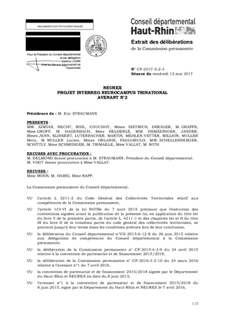 Dans le cadre de la convention de partenariat 2015/2018 du 8 juin 2015, signée entre le Département du Haut-Rhin et NEUREX, il est proposé : - d'accorder une subvention de fonctionnement d'un montant de 9 000 euros à NEUREX pour la poursuite du projet INTERREG "NeuroCampus Trinational" au titre de 2017, - d'approuver l'avenant n°2 à la convention de partenariat et de financement du 8 juin 2015 et d'autoriser le Président à le signer. Ce rapport a fait l'objet d'un avis favorable de la Commission Aménagement du Territoire et Economie en date du 24 mars 2017.