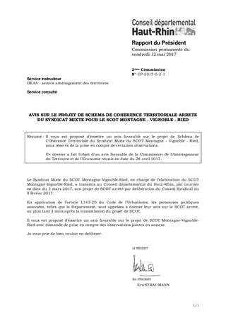 Il vous est proposé d'émettre un avis favorable sur le projet de Schéma de COhérence Territoriale du Syndicat Mixte du SCOT Montagne - Vignoble - Ried, sous réserve de la prise en compte de certaines observations. Ce dossier a fait l'objet d'un avis favorable de la Commission de l'Aménagement du Territoire et de l'Economie réunie en date du 28 avril 2017.