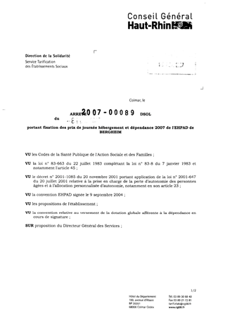 portant fixation des prix de journée hébergement et dépendance 2007 de l'EHPAD de BERGHEIM. Resumé Pièces jointes ARRETE Assemblée : Non défini Date : 08/02/2007 Rapporteur : Non défini Collectivité : Conseil départemental du Haut-Rhin Direction : Non défini Service : Service de la Tarification des Etablissements Domaine : Prix de Journée Commission :
