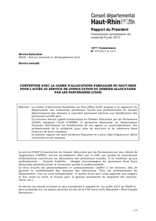 La Caisse d'Allocations Familiales du Haut-Rhin (CAF) propose à la signature du Département une convention permettant l’accès aux professionnels du Conseil départemental des données à caractère personnel relatives aux bénéficiaires des prestations qu’elle gère. Ce nouveau service appelé Consultation du Dossier Allocataire par les Partenaires (CDAP) remplace l’outil CAFPRO. Il permettra désormais au Département d’assurer directement les habilitations de ses agents et, particulièrement, des professionnels de la solidarité, pour plus de réactivité et de cohérence dans l’exercice de leurs missions. Le présent rapport est sans incidence financière et a pour objet d’approuver ladite convention et ses annexes.