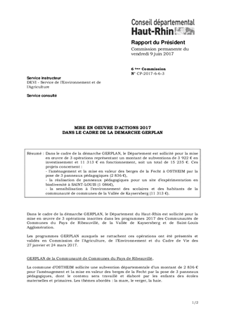 Dans le cadre de la démarche GERPLAN, le Département est sollicité pour la mise en œuvre de 3 opérations représentant un montant de subventions de 3 922 € en investissement et 11 313 € en fonctionnement, soit un total de 15 235 €. Ces projets concernent : - l’aménagement et la mise en valeur des berges de la Fecht à OSTHEIM par la pose de 3 panneaux pédagogiques (2 836 €), - la réalisation de panneaux pédagogiques pour un site d’expérimentation en biodiversité à SAINT-LOUIS (1 086€), - la sensibilisation à l’environnement des scolaires et des habitants de la communauté de communes de la Vallée de Kaysersberg (11 313 €).