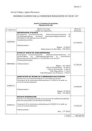 Dans le cadre de nos interventions en faveur du patrimoine, il vous est proposé d’allouer des subventions de fonctionnement pour un montant total de 468 200 €, réparties de la manière suivante : 312 000 € pour l’Archéologie d’Alsace 91 200 € pour le Syndicat Mixte du Hohlandsbourg 25 000 € pour l'Association du Musée de l'Impression sur Etoffes 40 000 € pour la Société Schongauer Il vous est également proposé d’approuver et de m'autoriser à signer les conventions à intervenir avec les partenaires précités. Ce rapport a fait l’objet d’un avis favorable de la 7ème Commission réunie le 7 avril 2017.