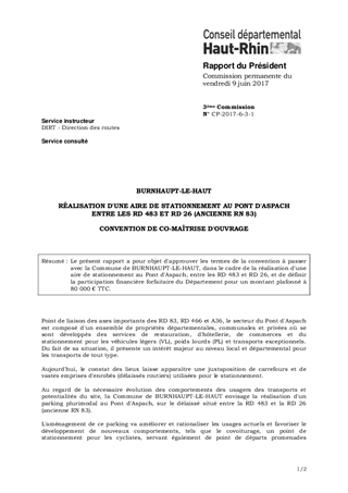 Le présent rapport a pour objet d'approuver les termes de la convention à passer avec la Commune de BURNHAUPT-LE-HAUT, dans le cadre de la réalisation d'une aire de stationnement au Pont d'Aspach, entre les RD 483 et RD 26, et de définir la participation financière forfaitaire du Département pour un montant plafonné à 80 000 € TTC.