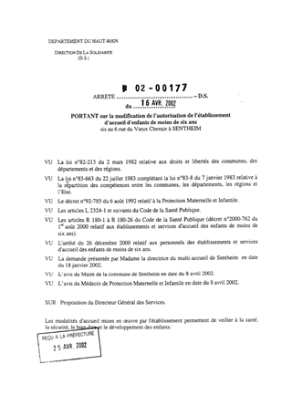 Portant sur la modification de l'autorisation de l'établissement d'accueil d'enfants de moins de six ans Resumé Pièces jointes ARRETE Assemblée : Non défini Date : 16/04/2002 Rapporteur : Non défini Collectivité : Conseil départemental du Haut-Rhin Direction : Non défini Service : Service de Protection Maternelle et Infantile Domaine : Accueil d'enfants Commission :