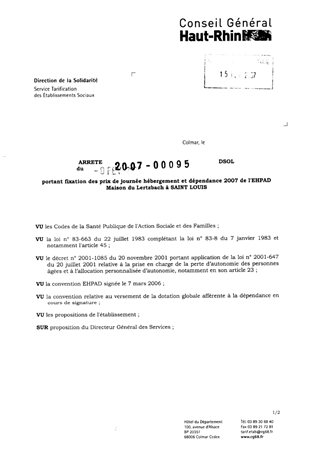 portant fixation des prix de journée hébergement et dépendance 2007 de l'EHPAD - Maison du Lertzbach à SAINT-LOUIS. Resumé Pièces jointes ARRETE Assemblée : Non défini Date : 09/02/2007 Rapporteur : Non défini Collectivité : Conseil départemental du Haut-Rhin Direction : Non défini Service : Service de la Tarification des Etablissements Domaine : Prix de Journée Commission :