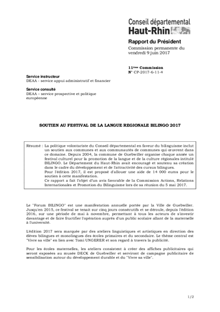 La politique volontariste du Conseil départemental en faveur du bilinguisme inclut un soutien aux communes et aux communautés de communes qui œuvrent dans ce domaine. Depuis 2004, la commune de Guebwiller organise chaque année un festival culturel pour la promotion de la langue et de la culture régionales intitulé BILINGO. Le Département du Haut-Rhin avait encouragé et soutenu sa création dans le cadre du développement et de l'attractivité des cursus bilingues. Pour l'édition 2017, il est proposé d'allouer une aide de 14 000 euros pour le soutien à cette manifestation. Ce rapport a fait l’objet d’un avis favorable de la Commission Actions, Relations Internationales et Promotion du Bilinguisme lors de sa réunion du 5 mai 2017.