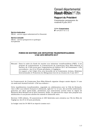 Dans le cadre du fonds de soutien aux initiatives transfrontalières (FSIT), il est proposé de subventionner la Communauté de Communes Pays Rhin-Brisach à hauteur de 2 500 euros pour l’organisation de l’édition 2017 de l’événement « L’Île aux enfants », les 24 et 25 juin prochains, à Vogelgrun. Ce rapport a fait l’objet d’un avis favorable de la Commission Actions, Relations Internationales et Promotion du Bilinguisme lors de sa réunion du 5 mai 2017.