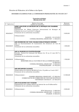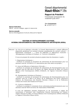 Au titre de sa politique culturelle, le Conseil départemental a adopté différents dispositifs permettant de soutenir diverses composantes du secteur culturel : « Expressions Artistiques », « Lieux de Diffusion et Opérateurs Culturels », «Enseignement Artistique et Pratique » et "Culture et Solidarité". Il vous est proposé de soutenir plusieurs projets dans les domaines ci-après : I « Expressions Artistiques » : - attribuer et autoriser le versement de subventions de fonctionnement pour un montant total de 103 800 € à 21 associations pour des aides aux projets ; II « Lieux de Diffusion et Opérateurs Culturels » : - attribuer et autoriser le versement de subventions de fonctionnement pour un montant total de 268 000 € en faveur de l'Opéra National du Rhin, du Centre Rhénan d'Art Contemporain (CRAC) d'Altkirch, de l'Agence Culturelle d'Alsace (ACA) ; III « Enseignement Artistique et Pratique » : - attribuer et autoriser le versement de subventions de fonctionnement pour un montant total de 2 800 € en faveur de la Fédération des Petits Chanteurs d'Alsace, de l'Association des Sociétés Chorales d'Alsace et de la Fédération d'Alsace de l'Union des Fanfares de France ; IV « Culture et Solidarité » : - attribuer et autoriser le versement d'une subvention de fonctionnement pour un montant total de 400 € en faveur de l'Association FACETTES ; Il vous est également proposé d’approuver et de m'autoriser à signer les conventions à intervenir avec l'Association Festival International de Colmar, l'Opéra National du Rhin, le Centre Rhénan d'Art Contemporain (CRAC) d'Altkirch et l'Agence Culturelle d'Alsace (ACA). Ce rapport a fait l’objet d’un avis favorable de la 7ème Commission réunie le 10 mars et le 7 avril 2017.