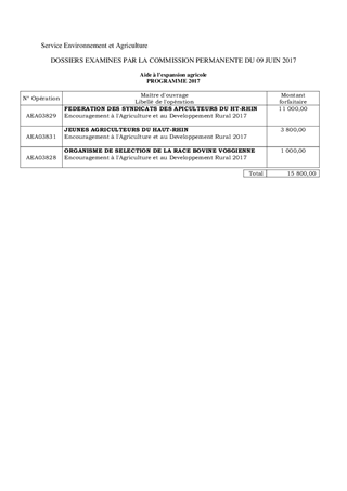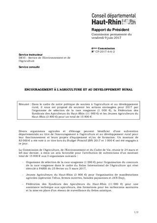 Dans le cadre de notre politique de soutien à l’agriculture et au développement rural, il vous est proposé de soutenir les actions envisagées pour 2017 par l’organisme de sélection de la race vosgienne (1 000 €), la Fédération des Syndicats des Apiculteurs du Haut-Rhin (11 000 €) et les Jeunes Agriculteurs du Haut-Rhin (3 800 €) pour un total de 15 800 €.
