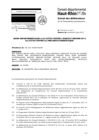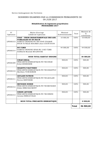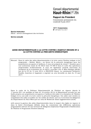 Dans le cadre des aides départementales à la lutte contre l’habitat indigne et du programme « Habiter Mieux » en faveur de la précarité énergétique pour les propriétaires occupants et bailleurs, il vous est proposé de retenir 7 dossiers pour une subvention totale de 56 500 € dont 44 000 € dans le cadre des opérations programmées mulhousiennes. Il vous est également proposé d’autoriser le versement de la subvention de 10 500 €, accordée à M. et Mme Philippe ANCEL lors de la CP du 13 juin 2014, à PROCIVIS Alsace. La commission Solidarité, Famille, Insertion et Logement a exprimé un avis favorable en date du 19 mai 2017.