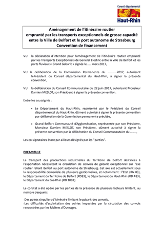 Le présent rapport a pour objet d’approuver les termes de la convention à conclure entre le Département du Haut-Rhin et la Communauté d’Agglomération du Grand Belfort afin de fixer les modalités financières du réaménagement de l’itinéraire routier emprunté par les transports exceptionnels entre la Ville de Belfort et le Port autonome de Strasbourg pour la livraison des pièces industrielles de 500 tonnes.