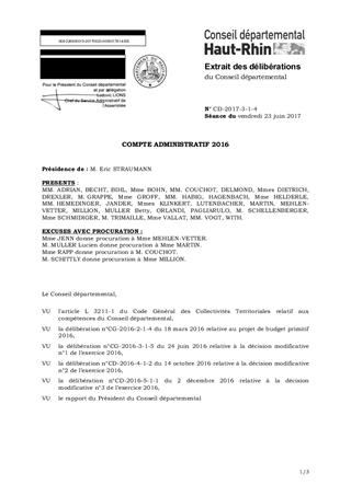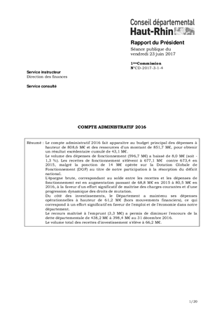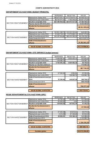 Le compte administratif 2016 fait apparaître au budget principal des dépenses à hauteur de 808,6 M€ et des ressources d'un montant de 851,7 M€, pour obtenir un résultat excédentaire cumulé de 43,1 M€. Le volume des dépenses de fonctionnement (596,7 M€) a baissé de 8,0 M€ (soit -1,3 %). Les recettes de fonctionnement s'élèvent à 677,1 M€ contre 673,4 en 2015, malgré la ponction de 14 M€ opérée sur la Dotation Globale de Fonctionnement (DGF) au titre de notre participation à la résorption du déficit national. L'épargne brute, correspondant au solde entre les recettes et les dépenses de fonctionnement est en augmentation passant de 68,8 M€ en 2015 à 80,5 M€ en 2016, à la faveur d'un effort significatif de maîtrise des charges courantes et d'une progression dynamique des droits de mutation. Du côté des investissements, le Département a maintenu ses dépenses opérationnelles à hauteur de 61,2 M€ (hors mouvements financiers), ce qui correspond à un effort significatif en faveur de l'emploi et de l'économie dans notre département. Le recours maîtrisé à l'emprunt (3,3 M€) a permis de diminuer l'encours de la dette départementale de 438,2 M€ à 398,4 M€ au 31 décembre 2016. Le volume total des recettes d'investissement s'élève à 66,2 M€.