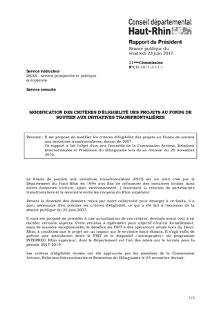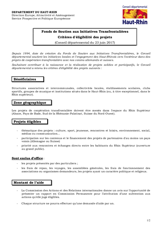 Il est proposé de modifier les critères d'éligibilité des projets au Fonds de soutien aux initiatives transfrontalières, datant de 2007. Ce rapport a fait l'objet d'un avis favorable de la Commission Actions, Relations Internationales et Promotion du Bilinguisme lors de sa réunion du 25 novembre 2016.