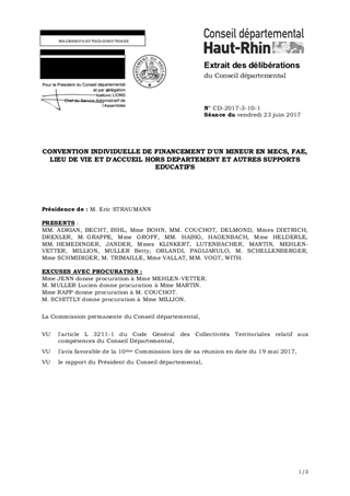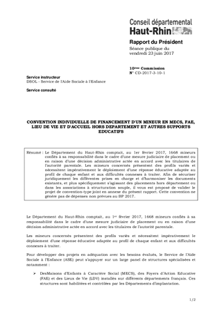 Le Département du Haut-Rhin comptait, au 1er février 2017, 1668 mineurs confiés à sa responsabilité dans le cadre d’une mesure judiciaire de placement ou en raison d’une décision administrative actée en accord avec les titulaires de l’autorité parentale. Les mineurs concernés présentent des profils variés et nécessitent impérativement le déploiement d’une réponse éducative adaptée au profil de chaque enfant et aux difficultés connexes à traiter. Afin de sécuriser juridiquement les différentes prises en charge et d’harmoniser les documents existants, et plus spécifiquement s’agissant des placements hors département ou dans les associations à structuration souple, il vous est proposé de valider le projet de convention-type joint en annexe du présent rapport. Cette convention ne génère pas de dépenses non prévues au BP 2017.